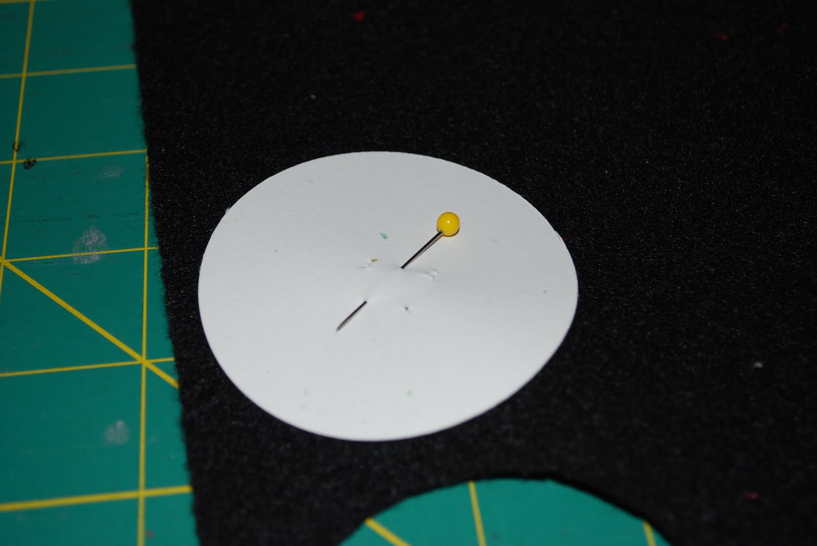 To get started, make yourself a circle pattern with scrap paper. I used a circle cutter and it is 2 1/2″ in diameter. Pin to felt, and cut 2.