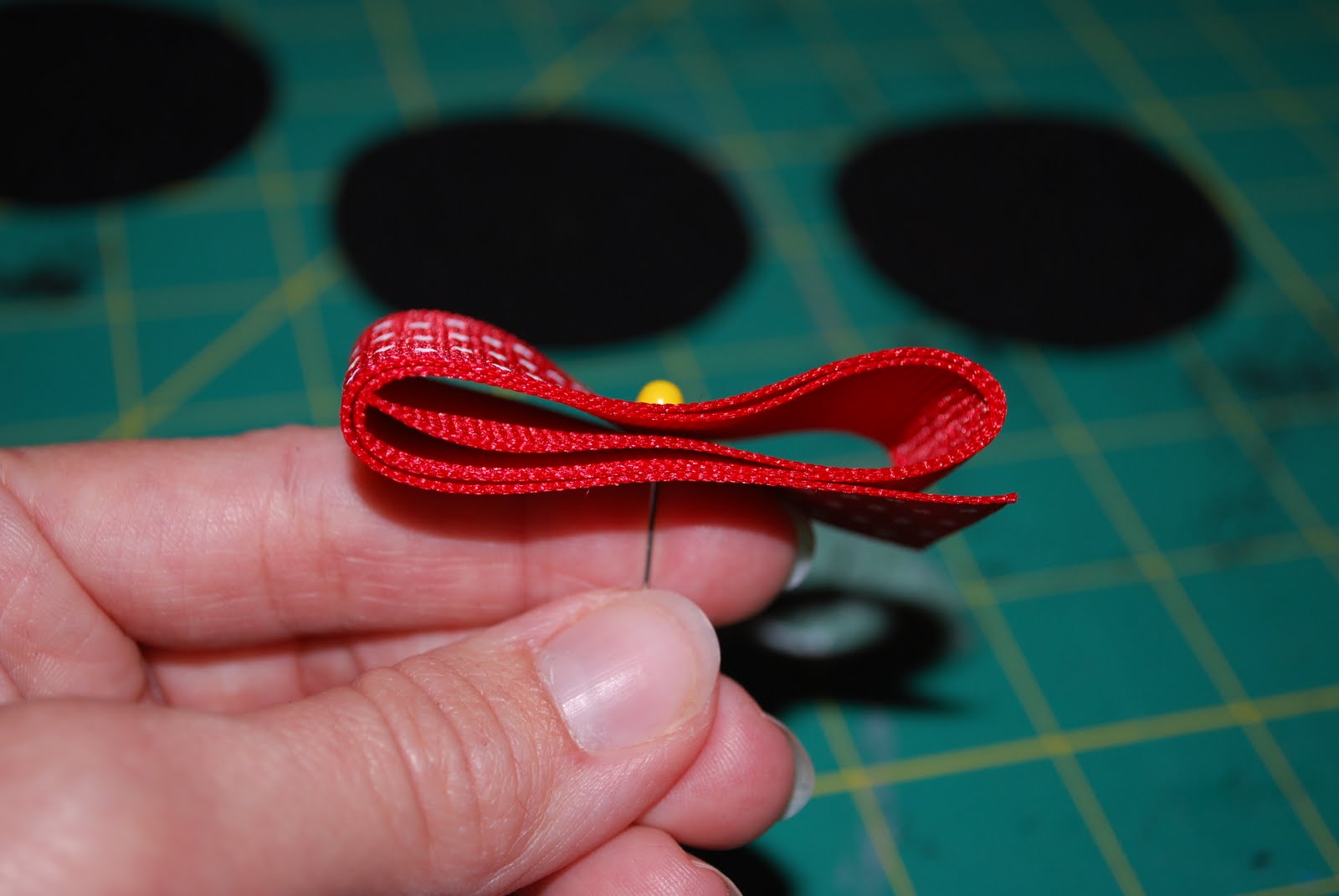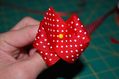 Now here comes the tricky part. I made a 2″ hair bow, so I made my folds at the 2″ mark using my quilting mat as my guide, and kept wrapping the ribbon until I had 2 loops for each side of the bow. Make sure to keep the stick pin in the center. It keeps the ribbon from falling apart.