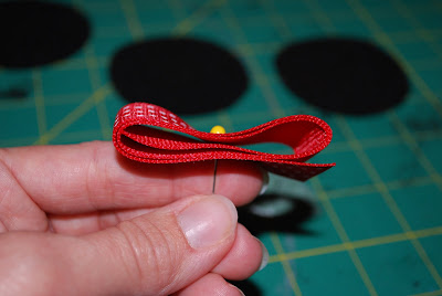 Take your needle and thread and stitch that into place. Tie it off. Then wrap the thread tightly around the ribbon to make it look like this: