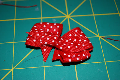 Place a small dot of glue on the back of the bow, and wrap the ribbon around the thread. Once the center ribbon is secure, trim any of the excess ribbon.